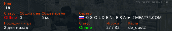 Играет на Counter Strike 1.6 сервере. Страна: РоссияПервый раз замечен 21:23 25.03.2026