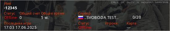Играет на Call of Duty 4: Modern Warfare сервере. Страна: РоссияПервый раз замечен 16:57 17.06.2025