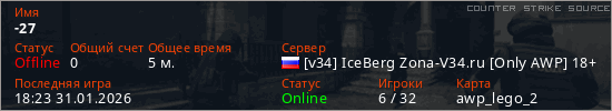 Играет на Counter Strike Source сервере. Страна: РоссияПервый раз замечен 18:15 31.01.2026
