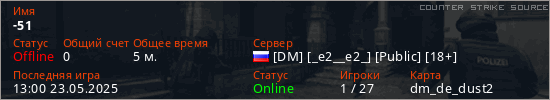 Играет на Counter Strike Source сервере. Страна: РоссияПервый раз замечен 12:30 23.05.2025