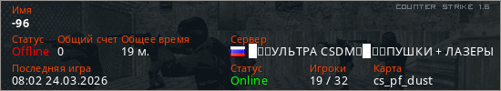 Играет на Counter Strike 1.6 сервере. Страна: РоссияПервый раз замечен 06:51 24.03.2026
