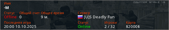 Играет на Counter Strike 1.6 сервере. Страна: РоссияПервый раз замечен 19:44 10.10.2025