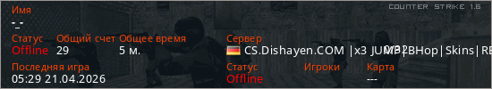 Играет на Counter Strike 1.6 сервере. Страна: ГерманияПервый раз замечен 05:27 21.04.2026