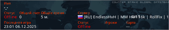 Играет на Counter Strike Global Offensive сервере. Страна: РоссияПервый раз замечен 22:38 06.12.2025