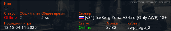 Играет на Counter Strike Source сервере. Страна: РоссияПервый раз замечен 13:10 04.11.2025