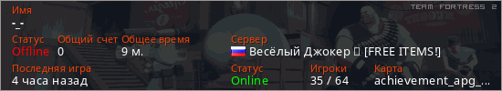 Играет на Team Fortress 2 сервере. Страна: РоссияПервый раз замечен 08:51 30.04.2026