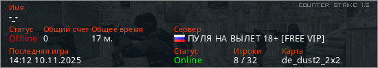 Играет на Counter Strike 1.6 сервере. Страна: РоссияПервый раз замечен 11:44 03.07.2025