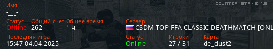 Играет на Counter Strike 1.6 сервере. Страна: РоссияПервый раз замечен 02:17 07.10.2021