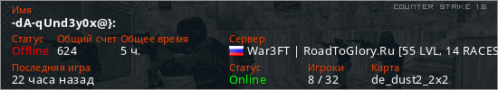 Играет на Counter Strike 1.6 сервере. Страна: РоссияПервый раз замечен 09:06 20.03.2026