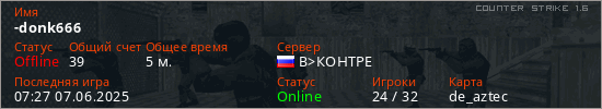 Играет на Counter Strike 1.6 сервере. Страна: РоссияПервый раз замечен 07:21 07.06.2025