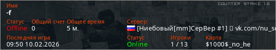 Играет на Counter Strike 1.6 сервере. Страна: РоссияПервый раз замечен 09:48 10.02.2026