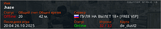 Играет на Counter Strike 1.6 сервере. Страна: РоссияПервый раз замечен 18:52 26.10.2025