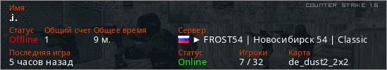 Играет на Counter Strike 1.6 сервере. Страна: РоссияПервый раз замечен 03:35 10.04.2026