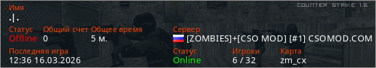 Играет на Counter Strike 1.6 сервере. Страна: РоссияПервый раз замечен 12:26 16.03.2026