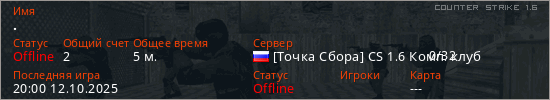 Играет на Counter Strike 1.6 сервере. Страна: РоссияПервый раз замечен 19:15 12.10.2025