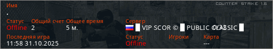 Играет на Counter Strike 1.6 сервере. Страна: РоссияПервый раз замечен 11:52 31.10.2025