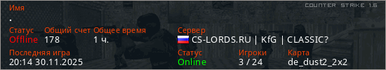 Играет на Counter Strike 1.6 сервере. Страна: РоссияПервый раз замечен 06:04 10.12.2024