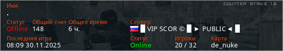 Играет на Counter Strike 1.6 сервере. Страна: РоссияПервый раз замечен 20:56 13.08.2025
