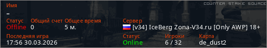 Играет на Counter Strike Source сервере. Страна: РоссияПервый раз замечен 17:52 30.03.2026