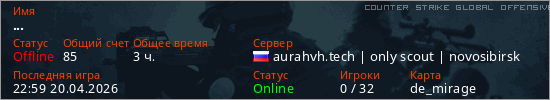 Играет на Counter Strike Global Offensive сервере. Страна: РоссияПервый раз замечен 21:05 09.04.2026