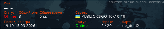 Играет на Counter Strike Global Offensive сервере. Страна: УкраинаПервый раз замечен 19:15 15.03.2026