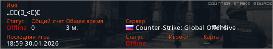 Играет на Counter Strike Source сервере. Страна: РоссияПервый раз замечен 18:59 30.01.2026