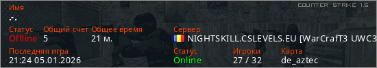 Играет на Counter Strike 1.6 сервере. Страна: РумынияПервый раз замечен 19:43 27.12.2025