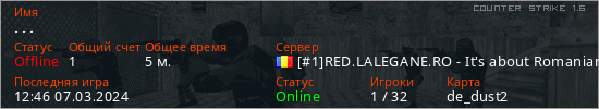 Играет на Counter Strike 1.6 сервере. Страна: РумынияПервый раз замечен 12:24 07.03.2024