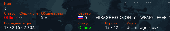 Играет на Counter Strike Global Offensive сервере. Страна: РоссияПервый раз замечен 17:28 15.02.2025