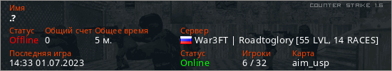 Играет на Counter Strike 1.6 сервере. Страна: РоссияПервый раз замечен 14:27 01.07.2023
