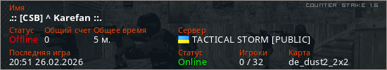Играет на Counter Strike 1.6 сервере. Страна: УкраинаПервый раз замечен 20:40 26.02.2026