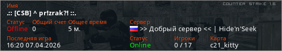 Играет на Counter Strike 1.6 сервере. Страна: РоссияПервый раз замечен 16:18 07.04.2026