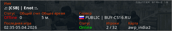 Играет на Counter Strike 1.6 сервере. Страна: РоссияПервый раз замечен 02:33 05.04.2026