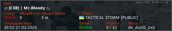 Играет на Counter Strike 1.6 сервере. Страна: УкраинаПервый раз замечен 20:48 21.02.2026