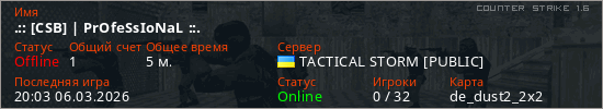 Играет на Counter Strike 1.6 сервере. Страна: УкраинаПервый раз замечен 19:30 06.03.2026