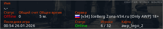 Играет на Counter Strike Source сервере. Страна: РоссияПервый раз замечен 00:09 26.01.2026