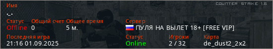 Играет на Counter Strike 1.6 сервере. Страна: РоссияПервый раз замечен 21:14 01.09.2025