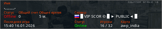 Играет на Counter Strike 1.6 сервере. Страна: РоссияПервый раз замечен 15:36 16.01.2026