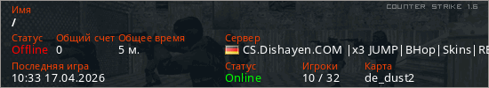 Последний раз был в сети 10:33 17.04.2026 Игрок с таким ником замечен на 57 серверах