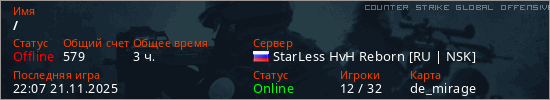 Играет на Counter Strike Global Offensive сервере. Страна: РоссияПервый раз замечен 17:00 17.10.2025