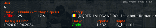 Играет на Counter Strike 1.6 сервере. Страна: РумынияПервый раз замечен 22:21 01.04.2024