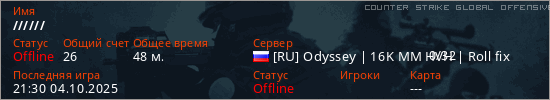 Играет на Counter Strike Global Offensive сервере. Страна: РоссияПервый раз замечен 22:00 21.09.2025