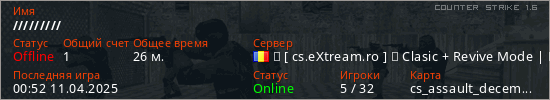 Играет на Counter Strike 1.6 сервере. Страна: РумынияПервый раз замечен 00:20 27.12.2024