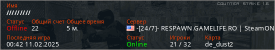 Играет на Counter Strike 1.6 сервере. Страна: СШАПервый раз замечен 00:40 11.02.2025
