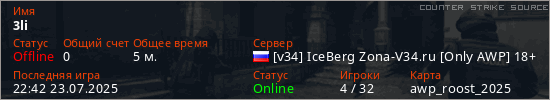 Играет на Counter Strike Source сервере. Страна: РоссияПервый раз замечен 22:39 23.07.2025