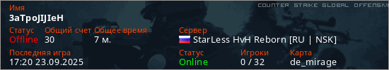 Играет на Counter Strike Global Offensive сервере. Страна: РоссияПервый раз замечен 17:03 23.09.2025