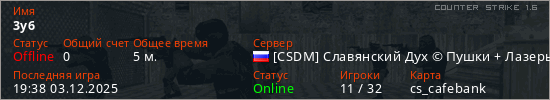 Играет на Counter Strike 1.6 сервере. Страна: РоссияПервый раз замечен 19:36 03.12.2025