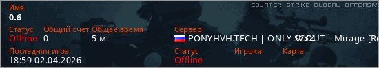 Играет на Counter Strike Global Offensive сервере. Страна: РоссияПервый раз замечен 18:55 02.04.2026