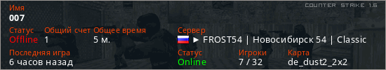 Последний раз был в сети 5 часов назад Игрок с таким ником замечен на 64 серверах