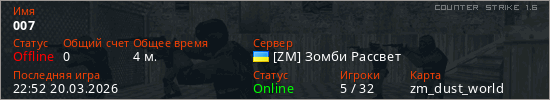 Играет на Counter Strike 1.6 сервере. Страна: УкраинаПервый раз замечен 22:48 20.03.2026